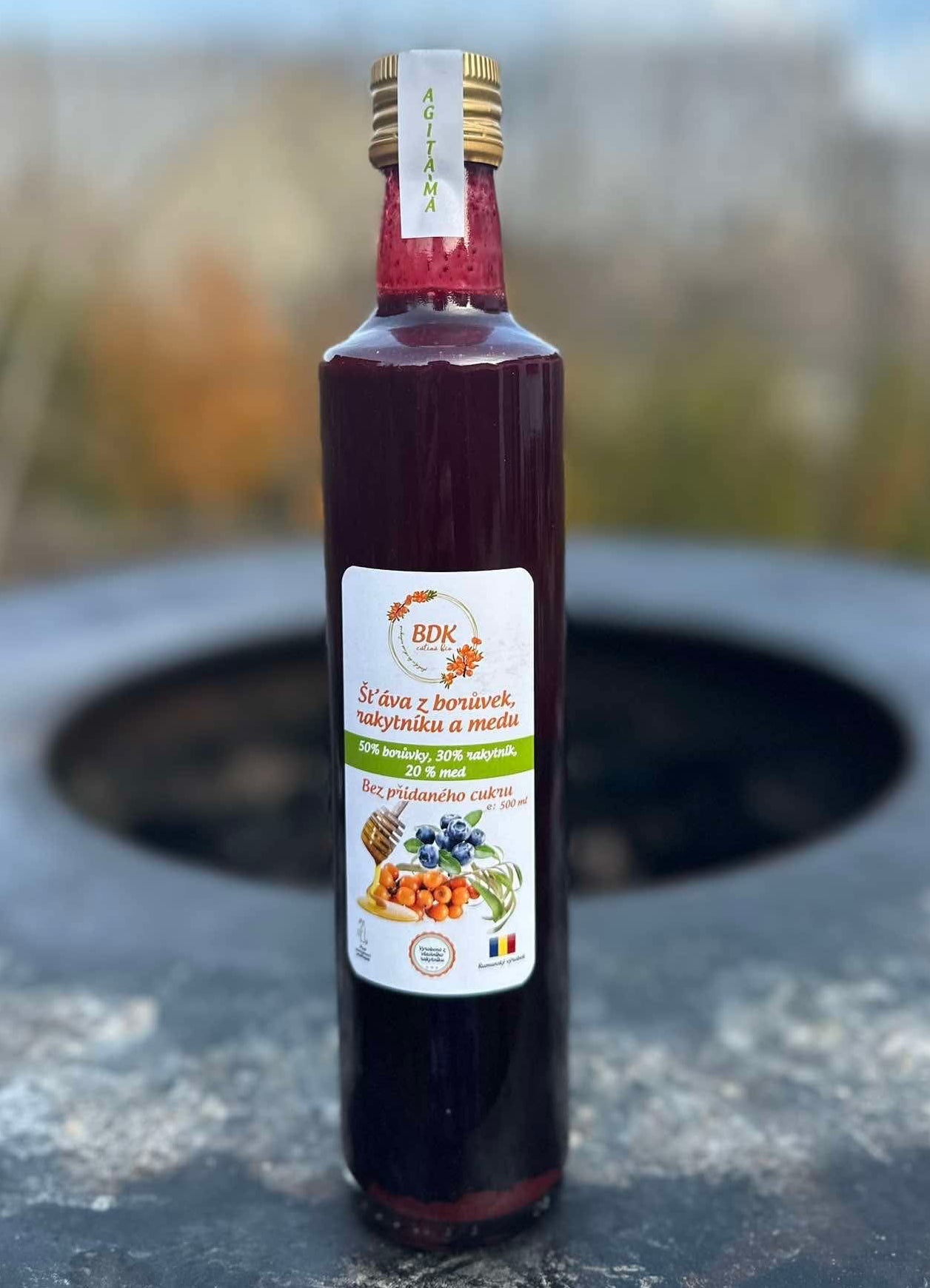 50 % borůvky, 30 % za studena lisovaný rakytník, 20 % med, sorban draselný.